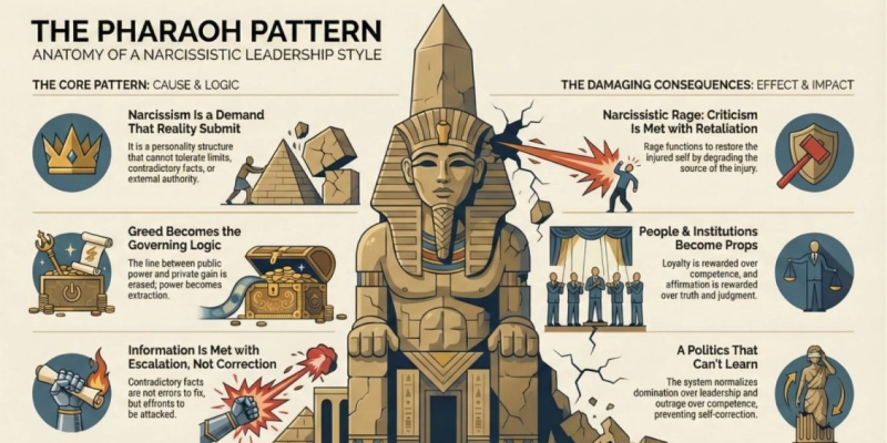 pattern recognition atau mengenali pola. Baginya, kisah Fir’aun menunjukkan bagaimana patologi pribadi seorang pemimpin dapat berubah menjadi prinsip pengorganisasian kehidupan publik. Dalam bahasa psikologi modern, ini sering disebut sebagai “kepemimpinan narsistik.”