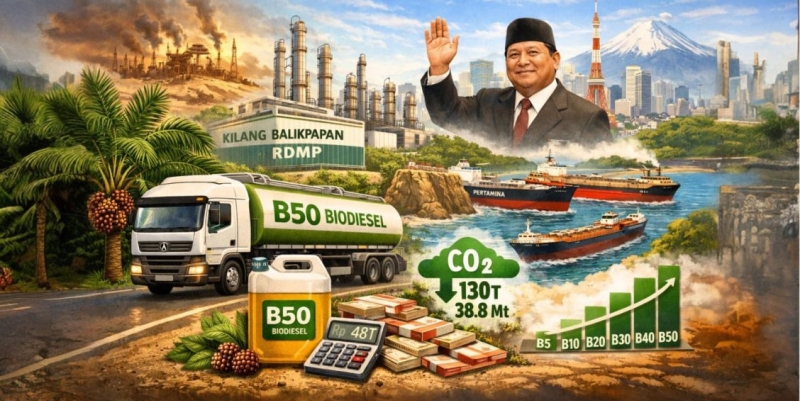Bahwa Presiden Prabowo Subianto mengumumkan ihwal B50 di Jepang, itu karena energi sedang dibahas di sana. Ketika Indonesia bicara B50 di Tokyo, itu seperti memberi pesan halus: “Kami sedang belajar mandiri, tapi tetap terbuka untuk kerja sama.”