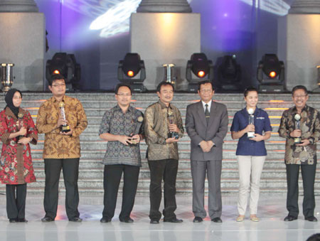 Sejumlah perwakilan media cetak dan media elektronik (dari kiri) Pemimpin Redaksi Rakyat Merdeka Ratna Susilowati, Pung Purwanto (Harian Seputar Indonesia), Budiman Tanuredjo (Kompas), Amos Ginting (TVRI), Ketua Mahkamah Konstitusi (MK) Mahfud MD, Intan Fahdiana (Metro TV) dan Karni Ilyas (TvOne) berpose bersama saat menerima Anugerah Konstitusi 2010. Penghargaan diberikan dalam rangka HUT MK ke-7 bertema "Pengawal Konstitusi dan Demokrasi" di Gedung MK, Jakarta, (Minggu 8/8) malam. Rakyat Merdeka juga diganjar penghargaan sebagai media berprestasi dalam penyebarluasan informasi tentang Konstitusi dan MK. [M ALI/JP]