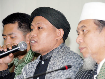 Anggota Dewan Syuro PKB, KH Mudjib Khudori (tengah) bersama KH Abdul Ghofur (kanan) memberikan keterangan kepada wartawan tentang rencana pembentukan Tim Khusus Pengendali Tindak Kekerasan oleh DPP PKB di Jakarta (Selasa 5/10). [DWI PAMBUDO/RM]