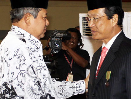 Presiden SBY memberikan Satya Lencana dalam bidang pembangunan kepada Sri Sultan Hamengkubuwono X pada puncak peringatan Hari Guru Nasional 2010 dan HUT ke-65 PGRI di Tennis Indoor Senayan, (Kamis 2/12) malam. ANUNG/RUMGAPRES