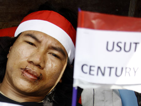 Aktivis Bendera saat melakukan aksi jahit mulut, dan tidur di dalam gerobak di Gedung KPK, Jakarta (Jumat 3/12). Mereka mendesak KPK segera mengusut tuntas kasus Century. NICK HANOATUBUN/RM