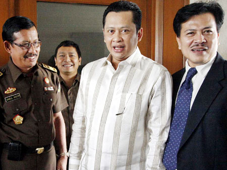 Dari kiri, Kapuspenkum Kejagung Babul Khoir, Wakil Ketua Kamar Dagang dan Industri (KADIN) Bambang Soesatyo dan Komite Tetap Hubungan lembaga Tinggi Negara Kadin, Kamsar seusai melakukan pertemuan di gedung Kejagung, Jakarta Selatan (Senin 20/12). DWI PAMBUDO/RM