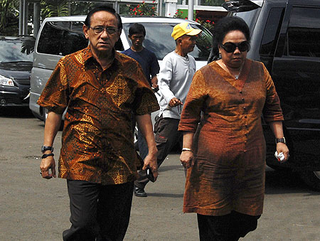 Sekjen PSSI, Nugraha Besoes didampingi istrinya saat tiba di Rumah Tahanan Kelas 1 Salemba Jakarta Pusat (Sabtu 29/1). Nugraha berniat menjenguk sohibnya yang ditahan karena menjadi tersangka kasus dugaan suap pemilihan bekas Deputi Gubernur Senior Bank Indonesia Miranda s Goeltom. PUTU WAHYU RAMA/RM