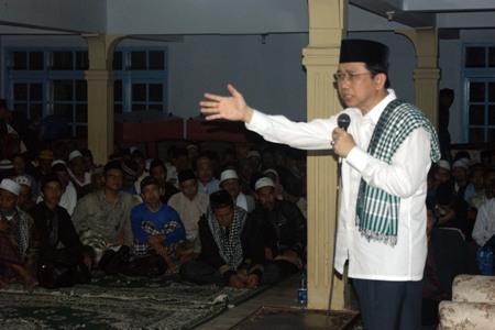Ketua DPR Marzuki Alie memberikan taushiah pada acara peringatan Maulid Nabi Muhammad SAW di Pondok Pesantren Darul Falah, di Warung Kondang, Cianjur Jawa Barat, Senin kemarin. Dalam kesempatan tersebut, Ketua DPR mengajak umat Islam untuk meneladani Nabi Muhammad SAW. [DEDE ZAKI MUBAROK/RMOL]
