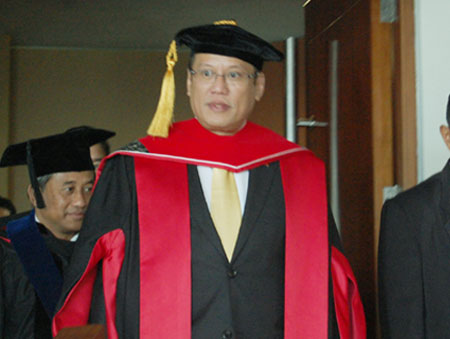RMOL. Presiden Filipina Benigno S Aquino III (kanan) keluar dari gedung serba guna UPH (Universitas Pelita Harapan) di Tangerang, Selasa (8/3). Hari itu, Aquino dianugerahi UPH gelar Doktor Honoris Causa sebagai penghormatan atas jasanya. [PUTU WAHYU RAMA/RM]