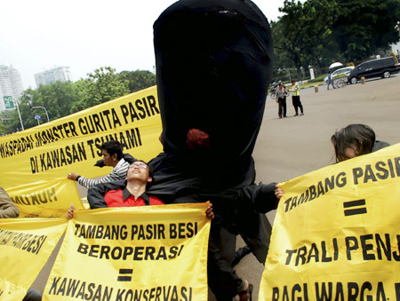 Aktivis Jaringan Advokasi Tambang (JATAM) dan Wahana Lingkungan Hidup (Walhi) melakukan aksi unjuk rasa di depan Istana Negara, Jakarta Pusat (Kamis 17/3). Mereka menuntut Presiden SBY membatalkan izin pertambangan pasir besi di kawasan rawan gempa, seperti di pesisir barat Sumatera, pesisir selatan Jawa, NTT, dan NTB, karena bisa merusak benteng penahan bencana. Runi/Rakyat Merdeka