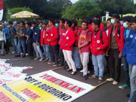 Kelompok mahasiswa dari DKI Jakarta dan Banten melakukan aksi turun ke jalan mengingatkan publik akan proses hukum skandal bailout Bank Century yang masih menggantung. Aksi ini digelar di seberang Istana Negara, Jakarta (Rabu, 13/4).