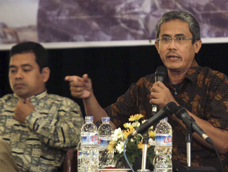 RMOL. Anggota Komisi Penyiaran Indonesia Judhariksawan (kiri) dan pengamat media Haris Jauhari, menjadipembicara dalam seminar internasional yang diselenggarakan Fakultas IlmuKomunikasi Universitas Prof DR Mostopo (Beragama) di Jakarta, (Kamis, 14/4). Seminar bertema: Peran Media Massa dalam Krisis Politik di Negara-Negara Arab. [DWI PAMBUDO/RM]