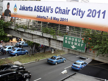 Baleho KTT ASEAN dengan wajah Gubernur DKI Fauzi Bowo terpampang di Jalan Sudirman, Jakarta, (Selasa 19/4). Sejumlah kalangan menduga pemasangan baliho tersebut sebagai bagian dari curi start kampanye pilkada DKI tahun 2012. YASIN HABIBI/RM