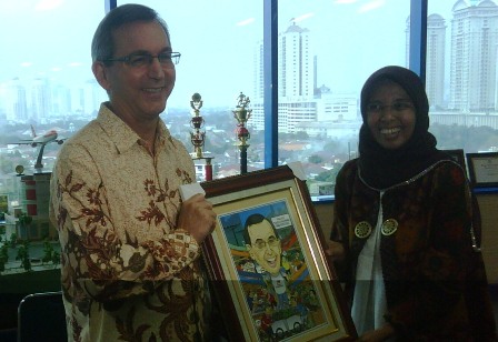 Dutabesar Amerika Serikat Scott Marciel (kiri) tertawa gembira menerima kartun dirinya sedang berkunjung ke pasar tradisional di Solo yang diberikan Pimred Harian Rakyat Merdeka, Ratna Susilowati. Scott Marciel mengunjungi Rakyat Merdeka Group di lantai 9, Graha Pena, Jalan Raya Kebayoran, Jumat siang (27/5). Ini adalah media visit pertama yang dilakukan Marciel sejak bertugas di Jakarta sepuluh bulan lalu. TEGUH SANTOSA/RMOL