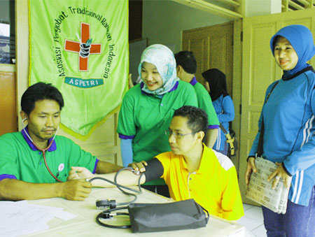 RMOL. Ketua Fraksi PAN DPR RI Tjatur Sapto Edy (tengah) didampingi istri yang juga Koordinator Baksos Asosiasi Pengobatan Tradisional Ramuan Indonesia (Aspetri) Jakarta Timur Dian Luthfianingtyas Sapto Edy (kedua kiri) saat acara bakti sosial pengobatan tradisional di Jakarta Timur, (Minggu, 29/5). Sekitar 410 orang warga setempat mengikuti acara tersebut. [MOHAMAD QORI/RM]