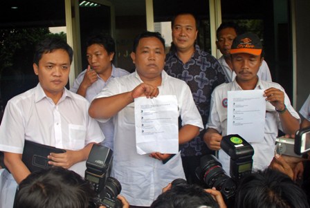 Pengurus Partai Gerindra Arief Poyuono alias AP (tengah) didampingi kuasa hukumnya Habiburokhman (kiri) bersama masa dari Serikat Pekerja BUMN menunjukan bukti print out usai melapor ke Polda Metro Jaya, Jakarta, Sabtu (4/6) terkait pencemaran nama baik dan tuduhan pengirim "SMS Nazaruddin. Arief alias AP dituduh sebagai orang dibalik pengirim "SMS Nazaruddin dari Singapura" yang mendeskreditkan Presiden SBY oleh pemilik Akun "@bangzul_pki" dan "@benny_israel" pada situs jejaring sosial mikroblogging Twitter. TEDY KROEN RAKYAT MERDEKA ONLINE