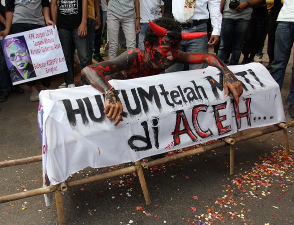 Massa dari Gerakan Rakyat Anti Korupsi (Gerak) Indonesia melakukan aksi teatrikal dengan seorang iblis yang mencengkeram keranda hukum saat berunjukrasa di depan Gedung Komisi Pemeberantasan Korupsi (KPK), Jakarta (Rabu (15/6).