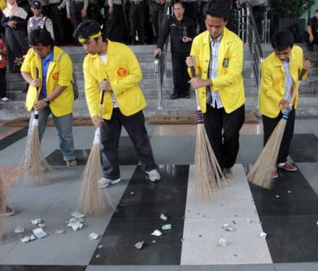 RMOL. Badan Eksekutif Mahasiswa Universitas Indonesia (BEM-UI) melakukan aksi teatrikal menyapu uang, saat berunjuk rasa di depan Gedung Komisi Pemberantasan Korupsi (KPK), Jakarta (Kamis 23/6). Aksi ini merupakan bentuk keprihatinan mereka terhadap kinerja KPK yang tidak jelas dan tegas dalam menangani sejumlah kasus korupsi yang melibatkan pejabat dan petinggi partai politik. [TEDY KROEN/RM]