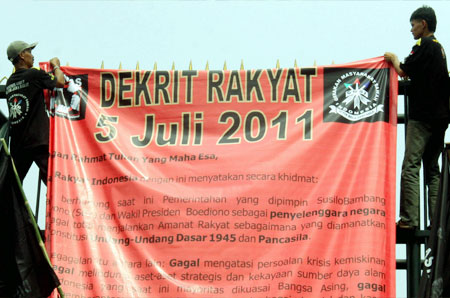 RMOL. Ratusan aktivis Gerakan Oposisi Nasional dan Gerakan Masyarakat Bawah Indonesia memperingati pembacaan Dekrit 5 Juli dengan berunjuk rasa di depan Gedung DPR, Selasa (5/7). Mereka mendesak pemerintah menjalankan amanah Pancasila dan UUD 45. [DWI PAMBUDO/RAKYAT MERDEKA]