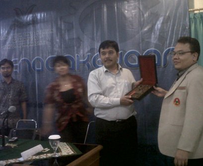 Ketua Umum PP Pemuda Muhammadiyah Saleh Partaonan Daulay (kanan) menyerahkan plakat penghargaan kepada Ketua Dewan Direktur Sabang Merauke-Circle, Syahganda Nainggolan usai Dialog Ketenagakerjaan dengan tema Dilema Buruh Migran Antara Martabat Bangsa dan Devisa Negara. Pada diskusi yang digelar di Aula PP Muhammadiyah, Jalan Menteng Raya, Jakarta Pusat tadi malam, juga dihadiri sebagai pembicara Direktur Migran Institut Dompet Dhuafa, Adi Chandra (kiri) dan Jubir Kemenakertrans Dita Indah Sari (kedua dari kiri). ZULHIDAYAT SIREGAR/RAKYAT MERDEKA ONLINE