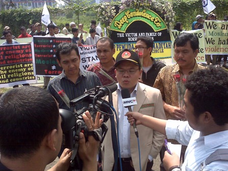 Ketua Umum Pemuda Muhammadiyah Saleh Partaonan Daulay, didampingi Direktur Sabang Merauke Circle, yang juga pembina Perhimpunan Pekerja Muslim Indonesia, Syahganda Nainggolan (kanan) dan Wasekjen Pemuda Muhammadiyah Sholehan Latundo (kiri), memberikan keterangan pers soal aksi solidaritas yang digelar di depan kantor Kedutaan Besar Norwegia, Menara Rajawali, Jalan Mega Kuningan, Jakarta, pagi ini (Rabu, 27/7). Aksi solidaritas ini ditujukan kepada korban peledakan bom di ibukota Norwegia, Oslo, dan penembakan brutal di Pulau Utoya, Norwegia, Jumat pekan lalu. [ISTIMEWA]