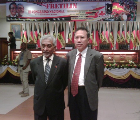 Ketua PP Muhammadiyah Syafiq Mughni (kanan) bersama Sekjen Fretilin Mari Alkatiri di arena Kongres III Fretilin di Dili, Timor Leste, Kamis siang (8/9). Dalam sambutannya Mughni mengatakan, Fretilin tidak asing di telinga warga Muhammadiyah. Fretilin yang dulu seringkali disebut sebagai partai komunis anti-Tuhan pada kenyataanya adalah partai yang sangat toleran pada agama. Bahkan, Kongres dibuka dengan doa kepada Tuhan Yang Maha Esa. Mari Alkatiri yang menjadi perdana menteri Timor Leste periode 2002-2007 adalah seorang Muslim. TEGUH SANTOSA/RMOL