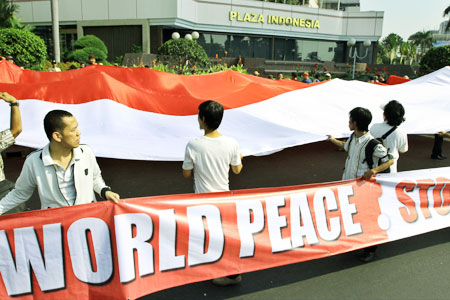 Peringatan tragedi bom WTC atau yang dikenal 9/11 di Amerika, ternyata diperingati juga warga Jakarta. (Minggu, 11/09). ratusan warga long march di bundaran Hotel Indonesia sambill membentangkan spanduk perdamaian. INDRA HARDI/RM