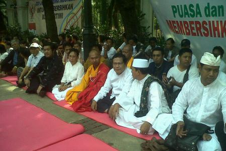 Sebagai bentuk keprihatinan terhadap kondisi bangsa Indonesia, ratusan tokoh dan aktivis lintas agama menggelar doa dan puasa selama tiga hari, mulai hari ini. Awalnya, kegiatan ini direncanakan digelar di depan Istana. Berhubung Istana sedang kedatangan tamu negara, untuk hari pertama doa dan buka puasa diselenggarakan di depan kantor Indosat, Jalan Medan Merdeka Barat. Tampak dalam foto, tokoh oposisi nasional, Rizal Ramli (ketiga dari kanan) diapit sejumlah tokoh agama yang terlibat dalam kegiatan tersebut. [ARI PURWANTO/RMOL]