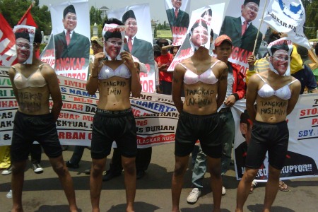 Puluhan aktivis yang tergabung dalam angkatan muda Nahdhatul Ulama menggelar unjuk rasa di depan Istana Negara, Jakarta siang ini. Dalam aksi yang memakai atribut pakaian dalam wanita ini, mereka mendesak Presiden SBY mencopot Menakertrans Muhaimin Iskandar karena telah memfitnah kiai. Karena berdasarkan pengacara salah seorang tersangka dalam kasus suap Kemenakertrans, disebutkan uang sebesar Rp 1,5 M akan diberikan kepada kiyai sebagai dana tunjangan hari raya. [FIRARDI ROZY/RMOL]