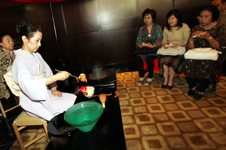 Seorang wanita Jepang tengah mendemonstrasikan penyajian teh ala jepang (cha ha no yau) dalam pembukaan Jak-Japan Matsuri 2011 di Hotel Nikko, Jakarta, (Minggu 18/9). Festival budaya yang berlangsung di kawasan Monas mulai 18-25 September, untuk memperkenalkan budaya jepang kepada masyarakat Indonesia. Festival tahunan ini digelar sejak 2009. INDRA HARDI/RM
