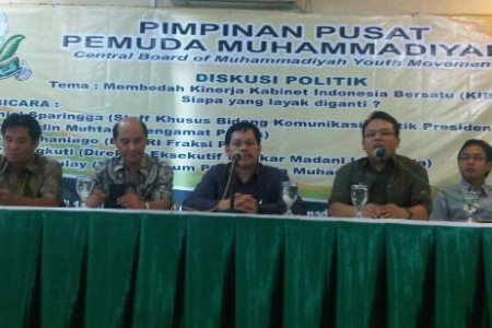 Direktur Lingkar Madani untuk Indonesia Ray Rangkuti, Staf Khusus Presiden Bidang Komunikasi Politik Daniel Sparingga, mantan Ketua PP Pemuda Muhammadiyah Amirsyah Tambunan, Ketua Umum PP Pemuda Muhammadiyah Saleh P. Daulay, dan pengamat politik dari Lembaga Survei Indonesia Burhanudin Muhtadi (kiri ke kanan) menjadi pembicara dalam diskusi dengan tema "Membedah KIB II, Siapa yang Layak Diganti?' di gedung PP Muhammadiyah, Jalan Menteng Raya, Jakarta Pusat siang ini. Diskusi yang digelar Pemuda Muhammadiyah ini juga dihadir anggota Komisi III F-PAN Taslim Chaniago. [ZULHIDAYAT/RMOL]