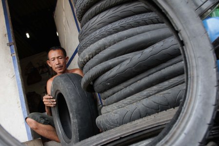 Rohman (52) mengerjakan motif pada ban bekas di rumah yang merangkap kios tempatnya berjualan di kawasan Kebon Melati, Tanah Abang, Jakarta (Sabtu (1/10). Harga ban bekas yang sudah di modifikasi rata-rata dijual Rp 50 ribu untuk ban mobil dan Rp 15 ribu untuk ban motor. Setiap hari, Rohman mampu memodifikasi 20 ban. TEDY KROEN/RMOL