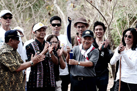 Duta Komodo Jusuf Kalla menerima obor api Sea Games ke-26 dari Wakil Gubernur NTT Esthon L.Feonay (depan kiri) di Pulau Komodo, Nusa Tenggara Timur (NTT), (Rabu 26/10). Ajang Sea Games ke-26 yang menggunakan maskot komodo merupakan sarana promosi untuk mendukung pemenangan Komodo sebagai tujuh keajaiban baru dunia, serta suksenya pertandingan olah raga se-Asia Tenggara yang diselenggarakan di Indonesia tersebut. FOTO Staf JK