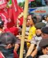 Mereka bergabung dengan massa buruh yang menuntut pengesahan Rancangan Undang Undang Badan Penyelenggara Jaminan Sosial.