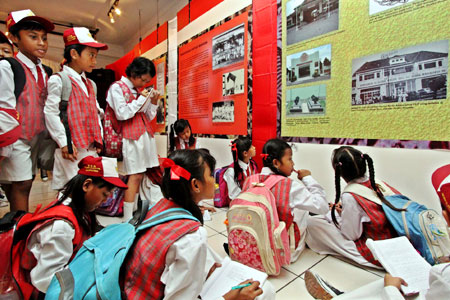 Sejumlah siswa-siswi dari SDN Cipinang Besar Utara 03 Pagi, Jakarta Timur, belajar sejarah dalam pameran tokoh pemuda 1928 Seogondo Djojoppoespito dalam peristiwa Kongres Pemuda yang melahirkan Sumpah Pemuda. Pameran foto itu digelar di Museum Sumpah Pemuda, Jakarta, (Jumat 28/10). DWI PAMBUDO/RM