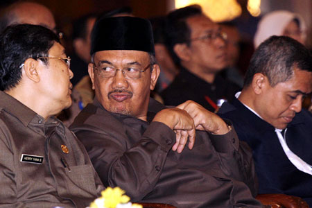 Menteri Pendayagunaan Aparatur Negara (PAN) dan Reformasi Birokrasi Azwar Abubakar (tengah) didampingi Deputi Pengawasan dan Akuntabilitas Aparatur Herry Yana Sutisna (kiri) dan Wakil Menteri Eko Prasojo saat menghadiri Rapat Koordinasi Nasional (Rakornas) Pelaksanaan Inpres Nomor 5 Tahun 2004 tentang Percepatan Pemberantasan Korupsi tahun 2011 di Jakarta, (Senin 7/11). Rakornas bertujuan untuk meningkatkan efektivitas pencegahan korupsi melalui penataan sistem dan manajemen kinerja aparatur negara dalam kerangka reformasi birokrasi. WAHYU DWI NUGROHO/RM