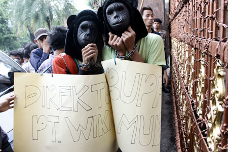 Puluhan mahasiswa yang menamakan dirinya Gempur Muba, berunjuk rasa di depan Gedung Kejaksaan Agung, Jakarta Selatan, (Rabu 16/11). Mereka menutup wajahnya dengan topeng monyet dan merantai tangannya. Para demonstran mendesak Kejaksaan Agung segera mengusut dugaan korupsi dan penyelewengan dan APBD 2010 pada pembanguan insfrastuktur di Kabupaten Musi Banyuasin, Sumatera Selatan. KORRY ELYANA/RM