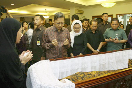Wapres Boediono didampingi Istri berdoa di depan jenazah Nuraini Mahdiyati, istri Menteri Perindustrian MS Hidayat di rumah duka, Jalan Sisingamaraja, Jakarta, (Sabtu 19/11). Almarhumah tutup usia di Surabaya dalam usia 64 tahun. RANDY TRI KURNIAWAN/RM