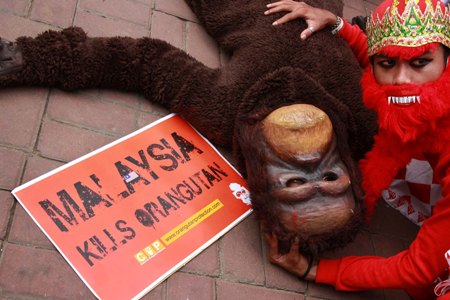 Sejumlah aktivis dari Centre for Orangutan Protection (COP) melakukan aksi teatrikal menggunakan pakaian orang utan dan tokoh pewayangan di depan Kedubes Malaysia untuk Indonesia, Jakarta, Selasa (22/11). Mereka mengutuk prilaku perusahaan-perusahaan kelapa sawit Malaysia yang beroperasi di Kalimantan yang telah membabat hutan yang berakibat membahayakan ekosistem orang hutan dan satwa liar lainnya. DWI PAMBUDO/RMOL