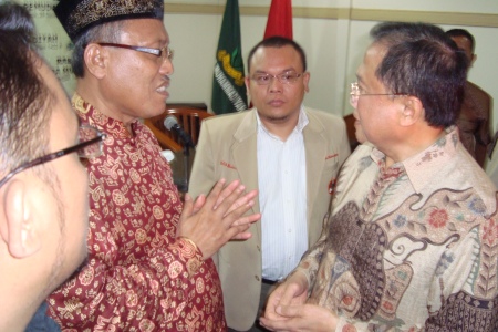 Ketua PP Muhammadiyah Abdul Fattah Wibisono (berpeci) berbincang dengan Menteri Sekretaris Kabinet Dipo Alam (kanan) disaksikan Ketua Umum PP Pemuda Muhammadiyah Saleh P. Daulay (tengah) usai pembukaan Rapat Koordinasi Nasional PP Pemuda Muhammadiyah di Hotel Mega Matra, Matraman, Jakarta, Jumat malam (25/11). Rakornas dengan tema Konsolidasi Gerakan Menuju Sinergitas Program direncanakan akan ditutup malam ini (Sabtu, 26/11). ZULHIDAYAT/RMOL