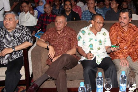 Ketua Dewan Direktur Sabang Merauke Circle Syahganda Nainggolan (kanan) berbincang dengan Ketua Umum DPP Partai Golkar Aburizal Bakrie (Kedua dari kanan) di sela-sela acara diskusi Reformulasi Strategi Pembangunan yang Berkeadilan di Papua yang diselenggarakan SMC di Hotel Le Meridien, Jakarta, (Selasa, 29/11). Juga tampak hadir, tokoh ICMI Adi Sasono (kedua dari kiri) dan Ketua Umum PP Muhammadiyah Din Syamsuddin. DWI PAMBUDO/RMOL