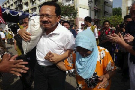 Gubernur DKI Jakarta Fauzi Bowo memanggul sekarung beras dan menggandeng tangan seorang wanita tua dalam pembagian beras untuk keluarga prasejahtera di Kelurahan Cakung Barat, Jakarta Utara (Minggu, 4/12). Dalam kegiatan itu, sebanyak 8.000 keluarga prasejahtera yang mendapatkan bantuan. Kegiatan ini hasil kerjasama antara Pemprov DKI Jakarta dan Yayasan Budha Tzu Chi. ISTIMEWA/RMOL
