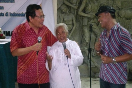 Ekonom senior, Dr. Rizal Ramli (kiri) bernyanyi bersama Ibu Toni (tengah berbaju putih) dalam Deklarasi Perjuangan Himpunan Pedagang Kaki Lima Indonesia (HPKLI) di Menteng, Jakarta Pusat, Kamis siang (22/12). Ibu Toni yang berusia 71 tahun adalah "komandan" PKL di kawasan Blok S dan Mampang, Jakarta Selatan. Tidak kurang 1.000 PKL di kawasan itu menjadikan Ibu Toni yang berdagang es doger di Blok S sebagai sesepuh mereka. YAYAN SOPYAN AL HADI/RMOL