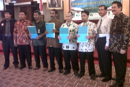 Empat pegawai kontrak Bank Indonesia diapit Ketua Umum Serikat Pekerja Bank Tabungan Negara Satya Wijayantara, President Director Riscon Realty Ari T. Priyono (pertama dan kedua dari kiri), dan Kepala Jamsostek Cabang Gatot Subroto Akhyad Munas serta Ketua Umum Ikatan Pegawai Bank Indonesia Agus Santoso (pertama dan kedua dari kanan). Mereka berpose bersama pada saat acara penandatanganan akad kredit 150 unit KPR BTN tipe 22/60 di gedung Bank Indonesia, Jalan Thamrin, Jakarta Pusat (Rabu, 28/12). [ZULHIDAYAT SIREGAR]