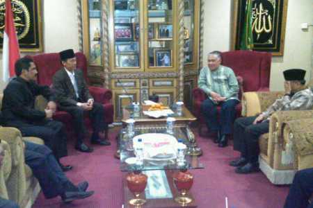 Ketua Umum PP Muhammadiyah M Din Syamsuddin (kedua dari kanan) siang tadi (Jumat, 6/1), menerima kunjungan Ketua Umum PP Baitul Muslimin Indonesia Hamka Haq (kedua dari kiri) beserta rombongan di gedung PP Muhammadiyah, Jalan Menteng Raya, Jakarta Pusat. Dalam kesempatan tersebut, Din menyarankan BMI garap umat Islam yang belum tersentuh dakwah, yang berjumlah sekitar 100 juta. [ZULHIDAYAT SIREGAR]