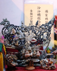 Diantara stand koperasi dan UKM, ada satu stand yang cukup menarik perhatian. Stand berukuran tak lebih dari 3x3 meter. Sedikit sekali hiasan Imlek di stand ini, hanya ada beberapa kaligrafi China saja dan memamerkan karya seni pasir dalam berbagai bentuk.