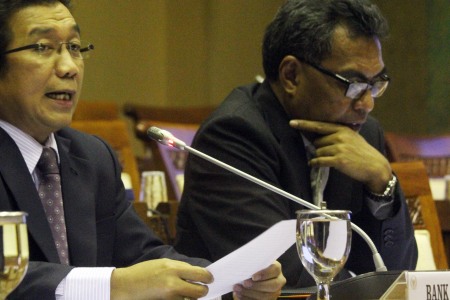 Deputi Gubernur Bank Indonesia bidang Penelitian dan Pengaturan Perbankan Muliaman Darmansyah Hadad dan Deputi Gubernur BI Bidang Akunting dan Sistem Pembayaran Ronald Waas menghadiri Rapat Kerja (Raker) dengan Komisi XI DPR Kompleks Parleman, Jakarta, Senin (16/01).