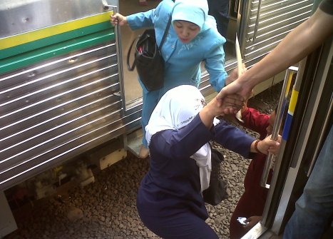 Beberapa penumpang Kereta Api Commuter Line jurusan Serpong-Tanah Abang di Stasion Sudimara tampak kesulitan untuk naik kereta. Hal ini disebabkan, KA jurusan Serpong-Tanah Abang yang berada di peron 1 terhalangi oleh kereta api jenis yang sama jurusan sebaliknya yang berhenti di peron 2. Terpaksa, penumpang yang akan naik KA jurusan Serpong-Tanah Abang harus melewati KA yang berada di peron 2. ZULHIDAYAT SIREGAR/RMOL