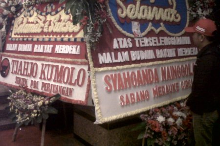 Para tokoh mengirimkan karangan bunga ucapan selamat atas pelaksanaan acara Malam Budaya Rakyat Merdeka 2012 yang digelar tadi malam di Balai Sudirman, Jakarta Selatan. Selain Syahganda Nainggolan dari Sabang Merauke Circle dan Tjahjo Kumolo dari PDIP, sejumlah tokoh lainnya juga melakukan hal yang sama. Mereka antara lain, Wagub DKI Jakarta Prijanto, mantan Menteri Kehakiman Yusril Ihza Mahendra, anggota DPR Chairuman Harahap dan Nuning Kertopati. [ZULHIDAYAT SIREGAR/RMOL]