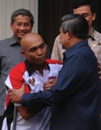 Presiden SBY terharu menyaksikan foto dirinya bersama pendaki tunadaksa berkaki satu dari Indonesia, Sabar Gorky, yang ikut dipamerkan di stand Rakyat Merdeka Group pada Hari Pers Nasional (HPN) 2012 di Jambi. Didampingi Ibu Ani Yudhoyono dan sejumlah menteri, SBY mengunjungi stand Rakyat Merdeka Group di arena pameran HPN yang digelar di kompleks pameran Taman Rimba, Jambi.