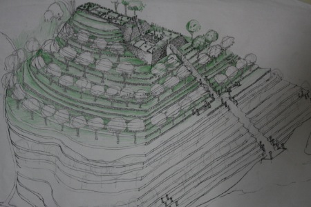 Ini adalah sketsa imajiner bangunan yang tertimbun di Gunung Padang, Cianjur, Jawa Barat. Sketsa ini digambarkan pakar arsitekur dari Bandung, Pon Puradjatnika. Tim Bencana Katastropik Purba ketika mengebor Gunung Padang hingga kedalaman 20an meter menemukan pasir hasil ayakan yang diduga menjadi salah satu material dalam pembuatan bangunan tersebut. Pon Puradjatnika juga memuji teknik penyusunan batu pada bangunan yang diperkirakan berusia 6.700 tahun itu mengingat ia berada di wilayah Sesar Cimandiri yang masih aktif. Sketsa ini diperoleh dari Tim Bencana Katastropik Purba. ISTIMEWA/RMOL