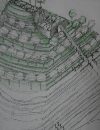 Ia mengasumsikan pundek berundak memiliki lima teras, dan masing-masing teras memiliki dimensi luas 50 x 100 x 10 meter. Apabila tiap batu dakon penyusu bangunan itu berukuran 0,3 x 0,3 x 1,5 meter diperlukan sebanyak 3.703.703 batu dakon yang beratnya diperkirakan 300 kilogram.
