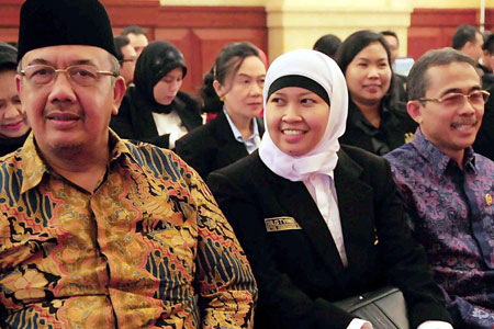 Menteri Pemberdayaan Aparatur Negara dan Reformasi Birokrasi, Azwar Abubakar, Ketua Umum Lembaga Advokasi Matahari Sulistyowati dan Ketua Komisi Yudisial Eman Suparman duduk bersama saat Deklarasi Lembaga Advokasi Matahari dan diskusi panel dengan tema "Hukum dan Ekonomi Saling Mengisi Atau Saling Meninggalkan" di Jakarta, (Rabu 22/2). DWI PAMBUDO/RM